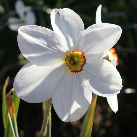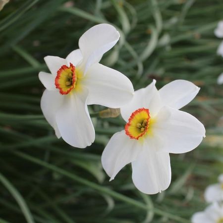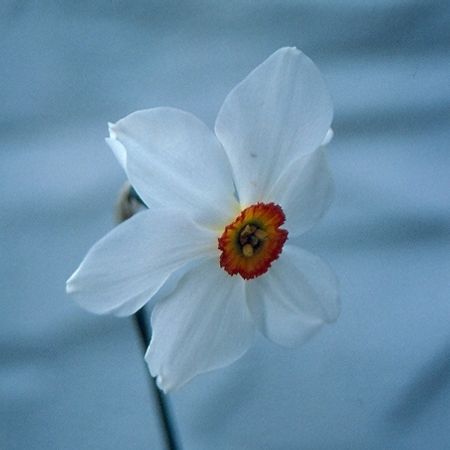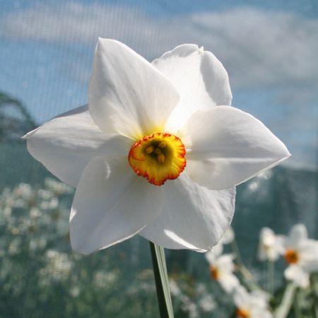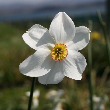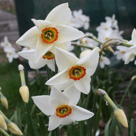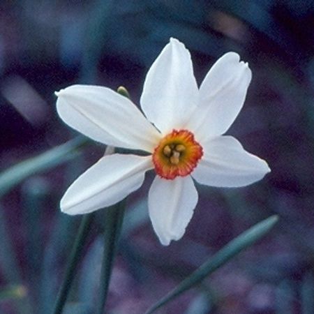 Characteristics of N. poeticus and N. radiiflorus clearly evident, such as a pure white perianth; very shallow corona, often with a red rim, and scented.