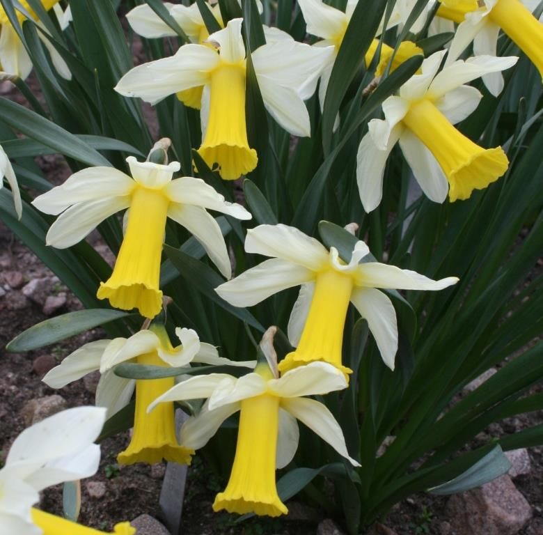 A daffodil of contrasts, combining the elegantly slender, long straight trumpet of N. abscissus with the obscurely lobed, lightly crenate and recurved trumpet rim of N. bicolor. These late-flowering bicolours are closely related, and we suspect that MIDTOWN ABBI is a hybrid between the two. The spreading perianth segments are closer to the white of N. bicolor than the sulphury cream of N. abscissus, but the midrib on the outer face is etched in pale gold. Narcissus bicolor has a lightly furrowed, soft canary-/empire-yellow trumpet; N. abscissus has bestowed the darker gold, turbinate perianth tube; narrower foliage and a dwarfer habit. We have pondered whether this might be ‘Ada Brooke’, but can’t entirely convince ourselves. It came from a collection planted pre-1907, so it’s certainly a very old cultivar.