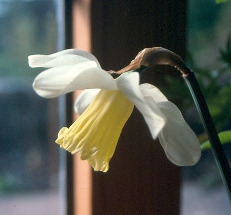 A sturdy Giant Leedsii of soft colouring and nodding habit on rather short stems. The spreading milk-white perianth segments appear to hover over the long, stout corona, lightly incurving, with strongly reflexed margins. At maturity the lightly flanged, primrose-yellow corona assumes a softer hue, and gradually flares to a gently bleached, obscurely lobed rim with wide crenations.