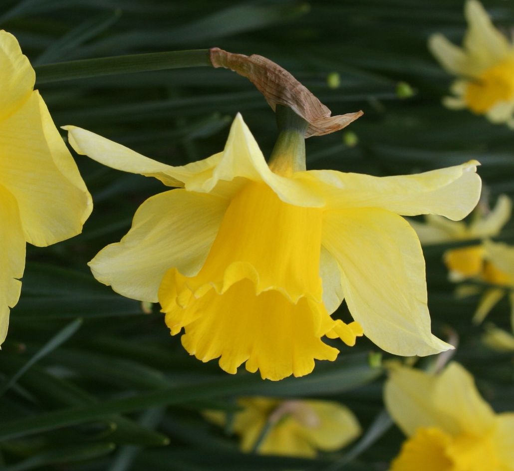 The “…largest clonal plant in the world…” asserts Andrew Tompsett in Golden Harvest (2006), meaning that a greater acreage of identical ‘Carlton’ bulbs was produced from the single, original, selected and named seedling than from any other vegetatively-propagated plant. The broad, creased perianth of “…soft, young duckling yellow…” (E.A. Bowles, 1934), fades to a softer hue of sulphur towards the tips and flushes bright canary-yellow at the base. The imposing corona is a stout, chiselled funnel of intense aureolin, flaring widely to a flamboyantly ruffled rim. Of iron constitution.