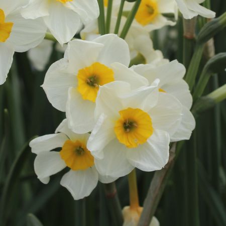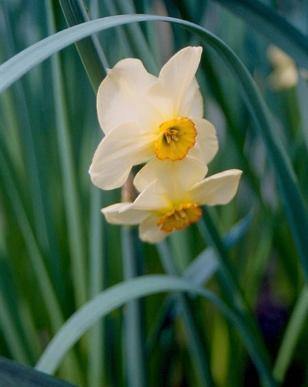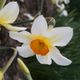 Poetaz with two medium-sized flowers per stem. Perianth segments pale lemony primrose; becoming sulphur-white stained lemon at base. Corona very shallow, regularly pleated, mostly lemon-yellow; shading through orange to bright red at lightly ruffled rim.
