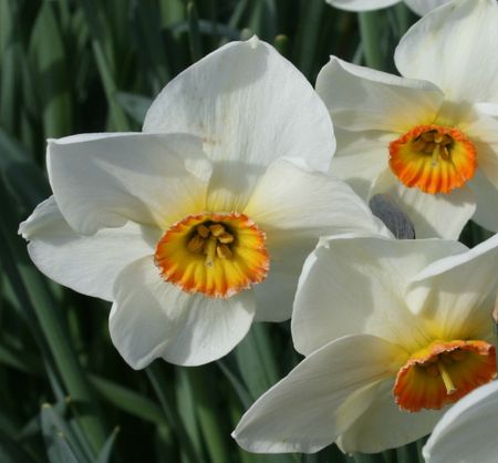 Similar to a Poeticus hybrid, with a broad, clean, white perianth and a very shallow, regularly pleated corona with a dull, moss-green eye; a narrow middle zone of muted dark yellow, and a broad band of reddish orange at the wavy rim.