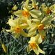 Similar to a Poeticus hybrid, with a broad, clean, white perianth and a very shallow, regularly pleated corona with a dull, moss-green eye; a narrow middle zone of muted dark yellow, and a broad band of reddish orange at the wavy rim.