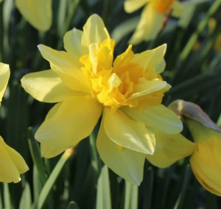 As with most double daffodils, the fulness of the flower can be highly variable. On our croft, the flower tends to be loosely double; sometimes the cup is intact, and contains not a scrap of petaloid material, but this stock was collected with a muddle of ruckled coronal petaloids. The outer, largest, aureolin ones nestled between two whorls of perianth petaloids which, in the ‘Sir Watkin’ scheme of things, were passable as regular perianth segments of soft primrose-yellow. The handful of perianth petaloids dispersed towards the centre are smaller and less shapely. The coronal petaloids become successively smaller, and more incurled, shading through chrome-yellow to a depth of marigold-orange at the centre.