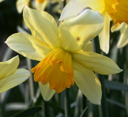 Although the Carparne drawings in the Lindley Library might appear inelegant at a first glance, time and again an invaluable characteristic or two can be gleaned from them. Thus Duncan found an illustration of the delightful and distinct flower we had referred to as HOWICK BEAUTY. For such an early hybrid, the flower is remarkably rounded. On opening, the perianth is sulphury mimosa-yellow, with a large, lightly pleated, broad funnel-shaped corona of soft amber, Chinese yellow and orange-buff shades, with an unevenly notched and broadly crenate rim tinged Spanish orange. As the flower matures, the perianth becomes pale sulphur, and the broadly elliptic to obovate outer perianth segments tend to recurve, whereas the inner segments incurve and become much narrower as the margins reflex most strongly either side of the midrib, lending a dishevelled look. The corona expands to a shallower wide bowl, and the orange shades fade to chrome-yellow at the lightly ragged rim, through strong lemon and gold hues to rich primrose-yellow near the distinctively dark eye zone.