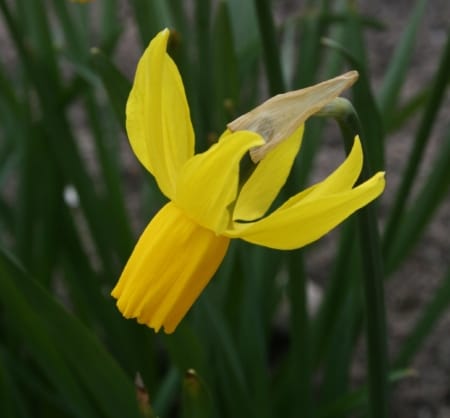 A good choice for planters and informal drifts, this dwarf, sturdy cultivar has well-balanced, long-lasting flowers. The straight, rich yellow, fluted corona becomes paler with age but remains darker than the slender, recurving perianth segments.