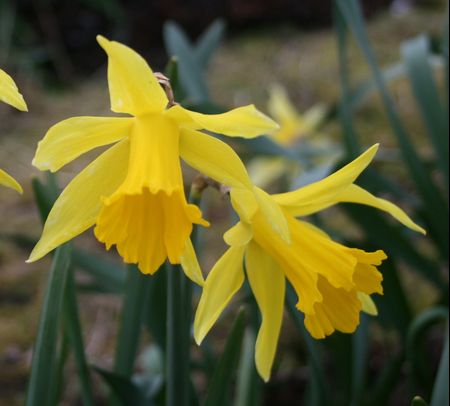 The larger, upper flower of t.1301 in Botanical Magazine (1810) effectively represents the recurving trumpet rim gashed into six deep lobes. The perianth segments tend to be less overlapping, and more slender and incurving than in N. hispanicus; the trumpet narrower and more chiselled, and the rim of each lobe only slightly ruffled due to two or three prominent ridges. The flower is spun from paler gold, verging on shades of mimosa-yellow. Below average height here, and flowering about mid-season.