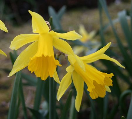 The larger, upper flower of t.1301 in Botanical Magazine (1810) effectively represents the recurving trumpet rim gashed into six deep lobes. The perianth segments tend to be less overlapping, and more slender and incurving than in N. hispanicus; the trumpet narrower and more chiselled, and the rim of each lobe only slightly ruffled due to two or three prominent ridges. The flower is spun from paler gold, verging on shades of mimosa-yellow. Below average height here, and flowering about mid-season.