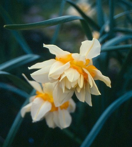 Flowers composed of shapely, cream-white, ovate petaloid segments, often densely arranged towards centre. Coronal segments much shorter, usually in a couple of continuous whorls of soft orange, darker at closely frilled rim. Known since the early 1700s.
