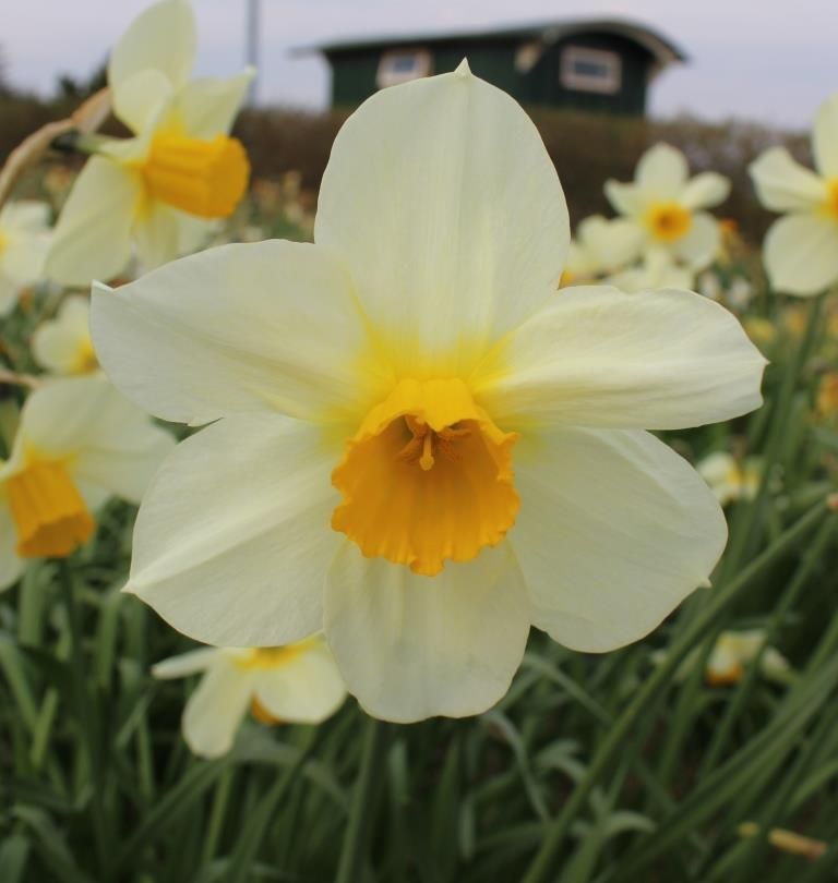 The 1913 R.H.S. Daffodil Year Book described ‘Pedestal’ as “one of the best flowers for a garden and also one of the best for the show table. It has wonderful lasting properties and the perianth always remains quite flat”. We are in full agreement a century later. The perianth, which is soft primrose-yellow on opening, soon passes to cream-white, stained bright lemon-yellow at the base. The outer perianth segments are broadly rounded elliptic; the inner broadly ovate near the base, and much tapered towards an acute tip. The margins of each segment recurve as the flower fades after weeks in flower alongside most of the Poets. The sunproof, neat corona of solid egg-yolk yellow, which opens almost straight, becomes a slightly flared funnel at maturity. The sparse but regular pleats create a gently ruffled rim. Brimful of poise, it is a beezer of a daffodil, with a slender flag-pole of a stem literally head and shoulders above other cultivars bred in the early twentieth century. Faintly sweetly scented.