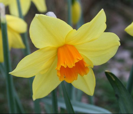 Perianth segments broadly ovate; bright lemon. Corona teacup-shaped rather than a bowl; regularly and lightly ridged; glowing orange shading to dull saffron-yellow at base; rim slightly wavy and crenate.