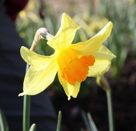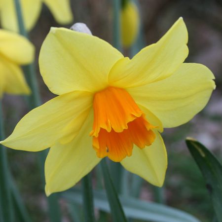 A relatively tidy, well-balanced, slightly nodding flower, richly coloured on opening. The perianth segments become a little reflexed, with recurving margins, fading from mimosa to soft primrose; a midrib bar of darker yellow remains. The corona is straight and neatly pleated at first, the interior Indian orange, the outer face softer; the rounded flanges are touched mimosa, particularly at the margin. As the flower matures, the cup flares a little and becomes suffused amber-yellow; the neatly ruffled rim is stained persimmon. Mid-season.