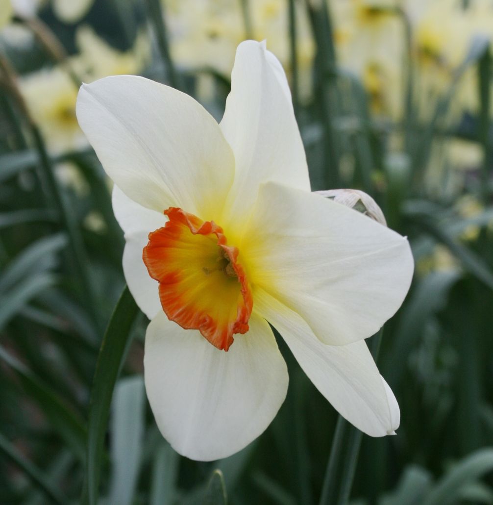 This tall, striking, late flower of exceptionally strong substance bears almost round, white perianth segments, spun with gold on opening, and a large, regularly-pleated, shallow, glowing gold, bowl-shaped corona generously margined Indian orange. Fittingly, with ‘Mozart’ as its parent, the opera-loving Brodie is likely to have named this vigorous and floriferous plant after that composer’s singspiel Il Seraglio, rather than after exotic Ottoman living-quarters set aside for wives and concubines – presumably in sharp contrast to Moray’s pink-harled bastion of Brodie Castle!