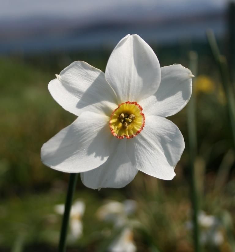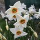 The clear, bright disk of a mature ‘Sonata’ reminds me of another favourite, the earlier-flowering ‘Ornatus’, whereas the conspicuous olive-green centre in a young flower is reminiscent of a quieter, less exuberant ‘Sea Green’. The slightly reflexed perianth segments can be very broad and blunt, but appear longer and more acute as the margins incurve. The clear white segments narrow abruptly to the base, reducing the degree of overlap. The narrow crimson rim of the circular corona is closely, regularly, minutely crenulate, fading to rich coral-pink/red, with a paper- white ring developing between it and the principal zone of soft lemony yellow, which remains slightly richer and less chalky than in ‘Ornatus’. With us, the softly, sweetly scented ‘Sonata’ flowers slightly earlier than ‘Sea Green’ and ‘Hexameter’. Of average height.