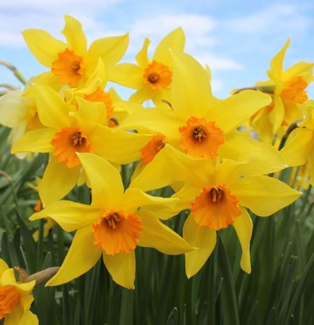 A cheerful flower with spreading, scarcely overlapping, slender-ovate, mimosa-yellow perianth segments, which tend to recurve and twist jauntily. On opening the slightly flaring, angular funnel of Indian orange is closely, deeply pleated but, as the flower matures and the corona expands, the colouring and the ridges soften and fade, leaving a darker eye zone, and the margin becomes obscurely scalloped in places, and unevenly, lightly ruffled. Slightly below average height; flowering early mid-season.
