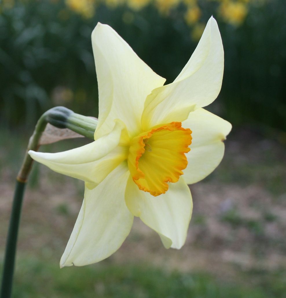 Tall and elegant, an endearing flower, with the prettiest of cups, and a light, sweet scent. The perianth segments are translucent primrose-yellow on opening, fading paler with a flourish of bright sulphur at the base and along overlapping margins. The corona is a neat, shallow bowl of bright canary-yellow; widely expanded, with a boss of plump, palest chrome-yellow stamens, backlit by soft apple-green. The deep, even pleats create a lightly ruffled, crenulate rim margined orangey buttercup-yellow. The entry in P. de Jager & Sons’ Flower-Bulbs catalogue of 1939 runs “…this is indeed a very fine variety. …A perfect flower of outstanding beauty and distinct colour, vigorous grower, a beautiful garden plant…”. In spite of imperfections such as deeply-creased perianth segments with incurving margins, and a less-than-circular corona, this is a flower of much grace and charm. There is hope for us all. [Very few available.]